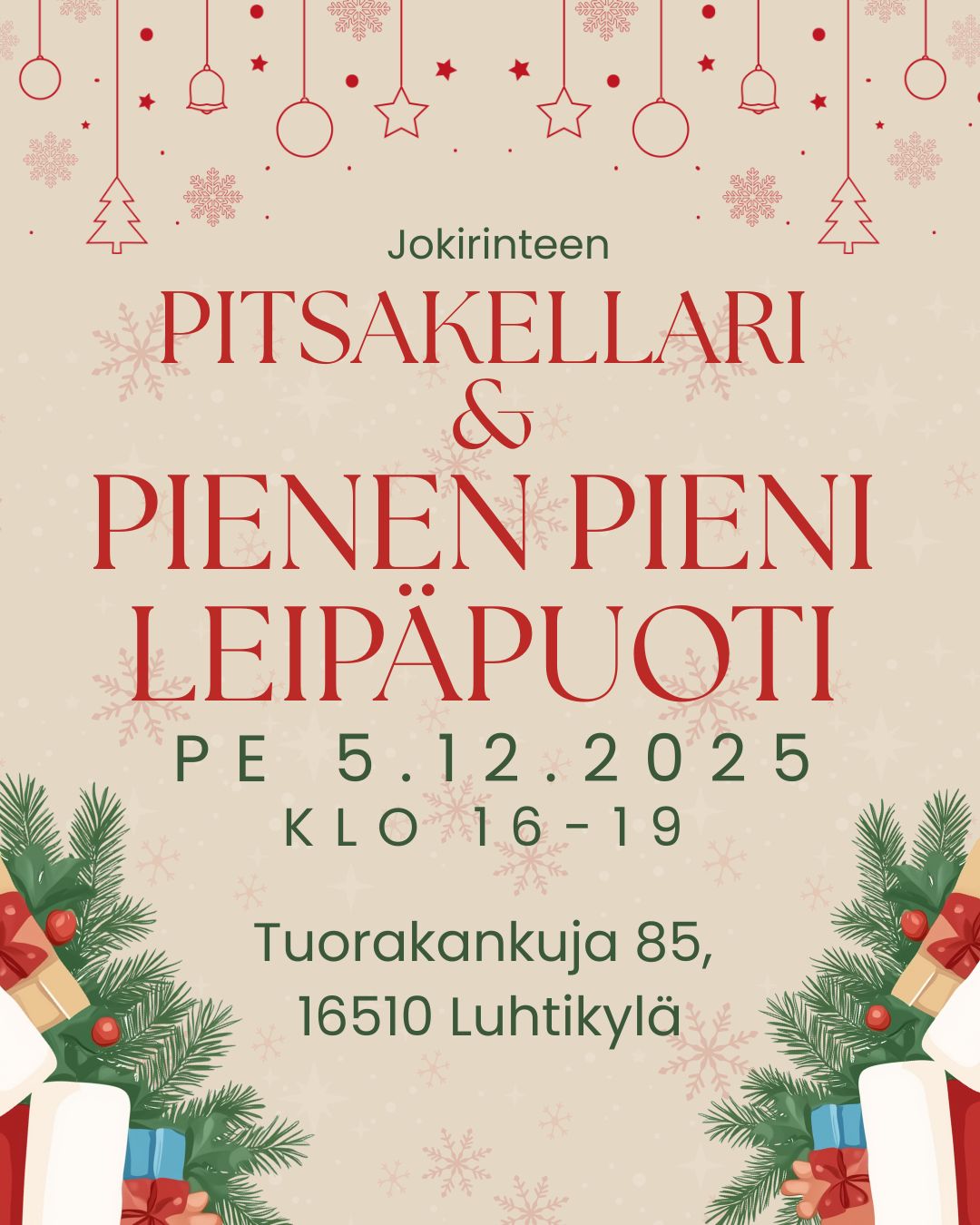 Perjantaina 5.12.klo 16-19 on avoinna niin Pitsakellari kuin Pienen Pieni Leipäpuotikin! Lasikuisti pukeutuu jouluiseksi pikkupuodiksi ja nyt on aika hankkia joulun leivät pakkaseen sekä pienet muistamiset pukinkonttiin. Puodissa leipomusten lisäksi ihania pipoja, runokirjoja, havukransseja ja yrttejä tästä napurustosta.